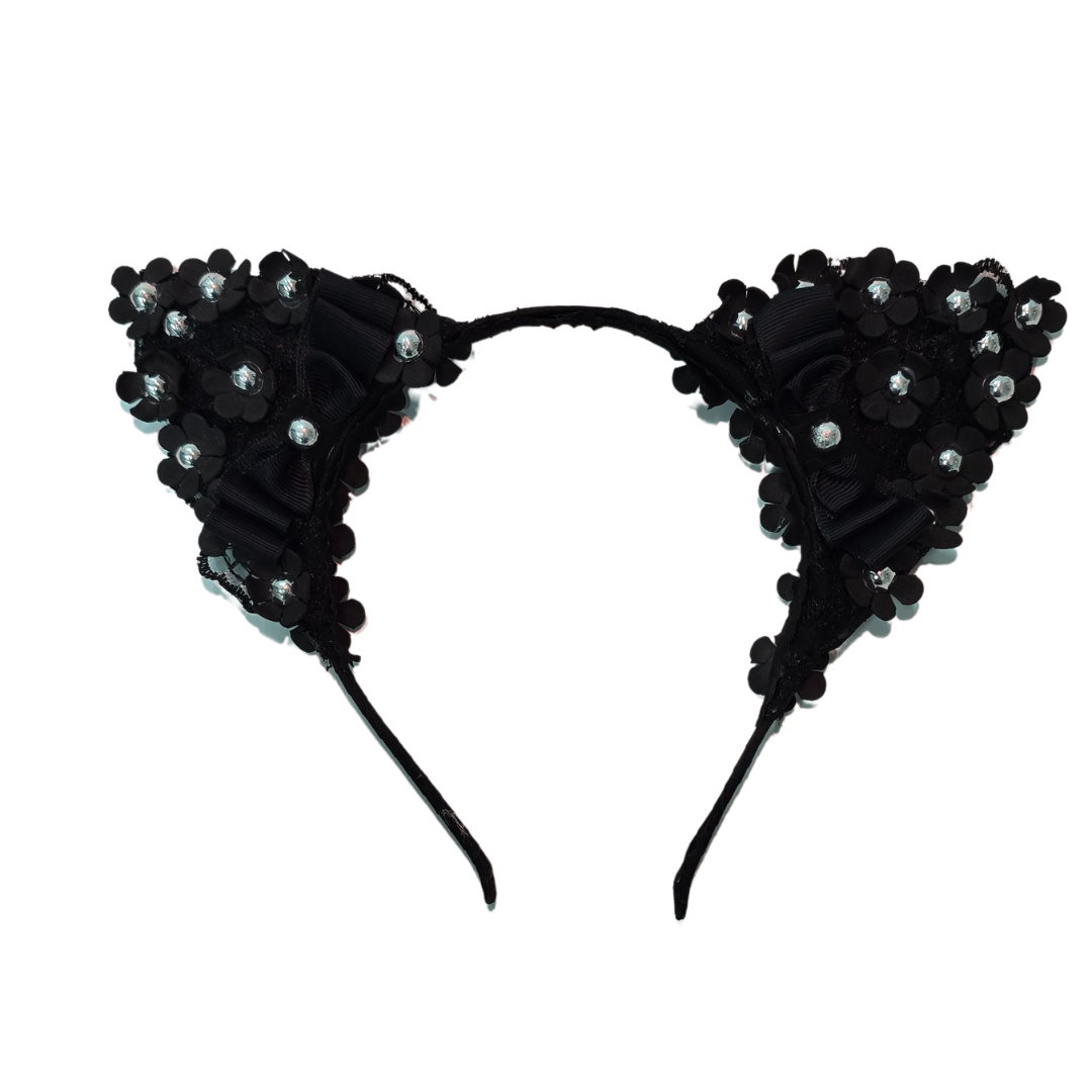 На прочном ободке закреплены роскошные ушки из атласных лент и блестящей фурнитуры.